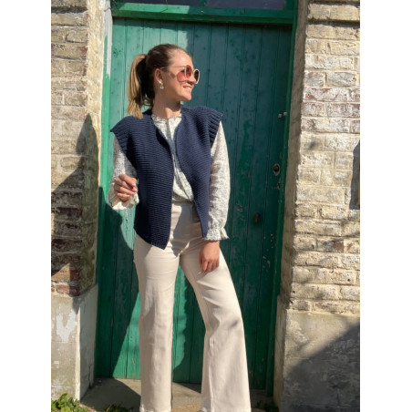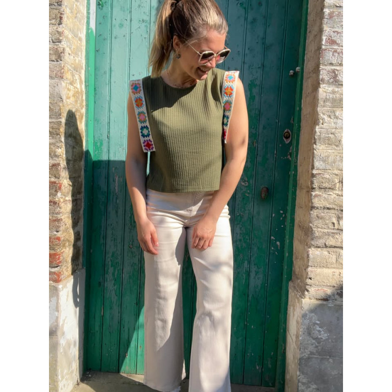 Jeans coupe droite beige avec détails de la couture forme coeur à l'arrière au niveau des poches