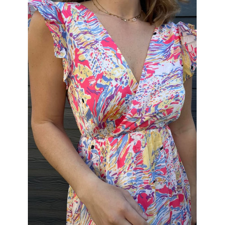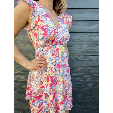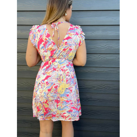Robe courte avec volants sur les épaules, coupe cache coeur avec à l'arrière 2 cordons pour resserrer