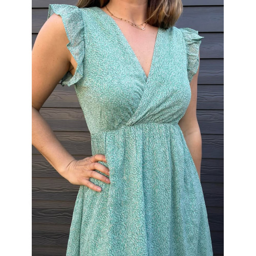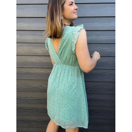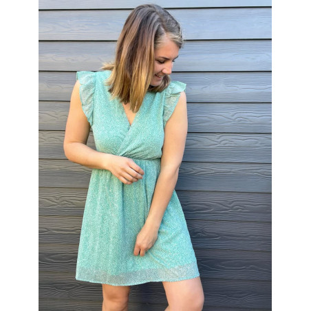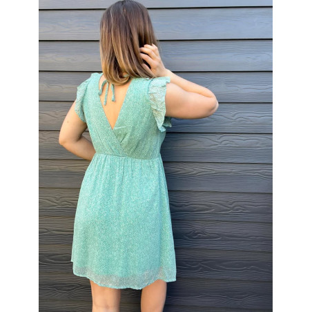 Robe courte avec volants sur les épaules, coupe cache coeur avec à l'arrière 2 cordons pour resserrer
