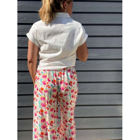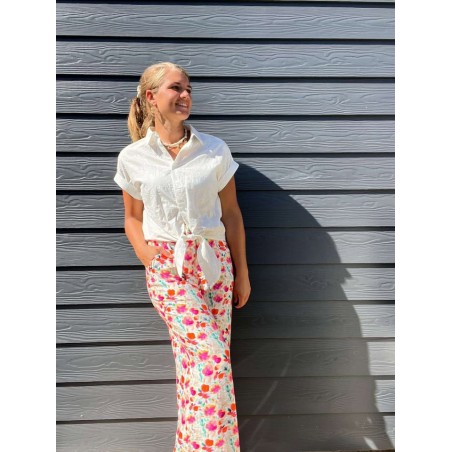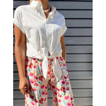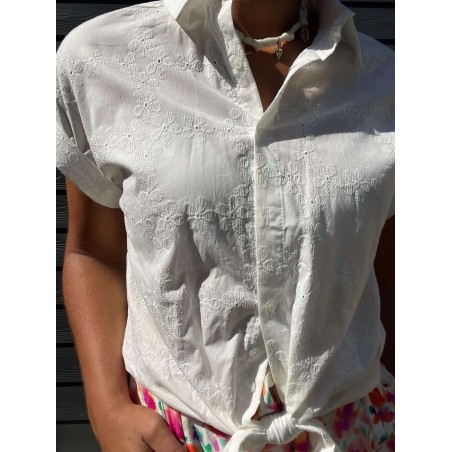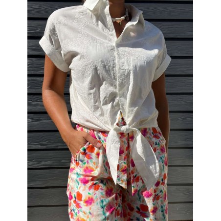 Chemisier manches courtes à nouer sur le bas avec broderies fleuries