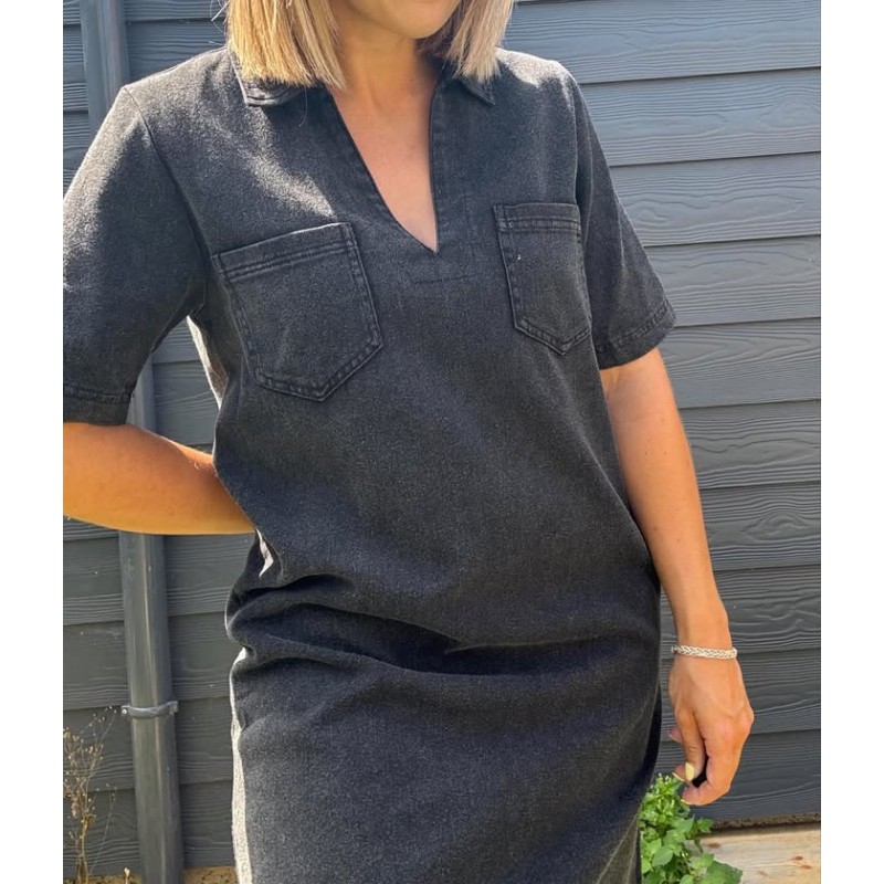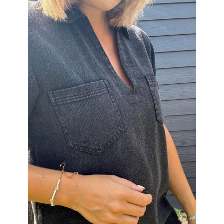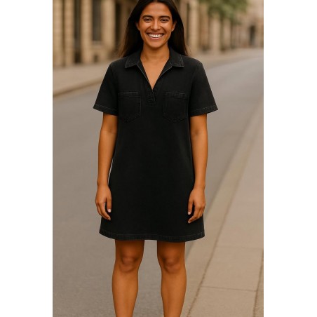 Robe courte en jeans, matière légère avec détails d'une poche à l'avant et col chemisier
