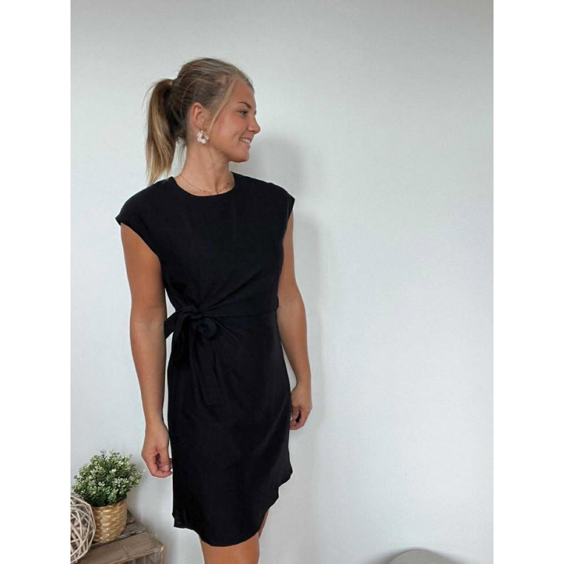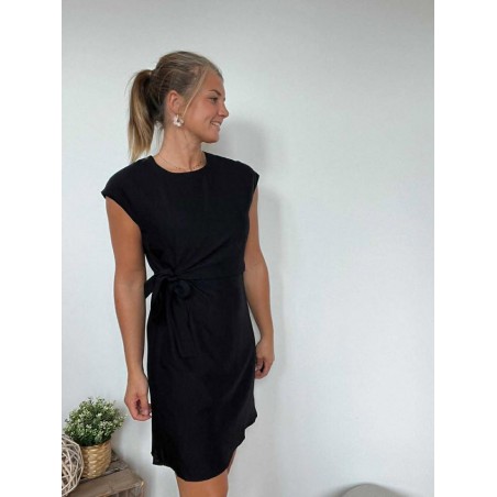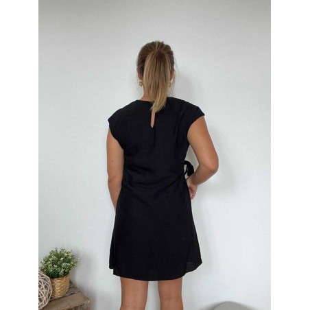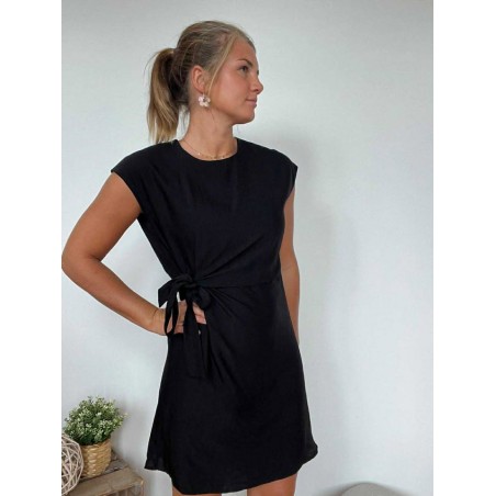 Robe qui vient se cintrer avec le noeud, bouton au dos pour refermer