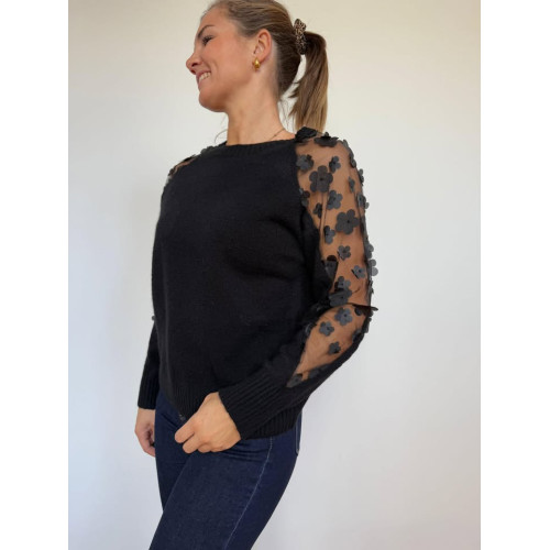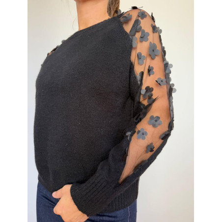 Pull col rond avec les manches transparentes brodées de petites fleurs