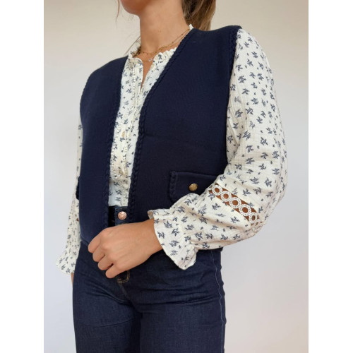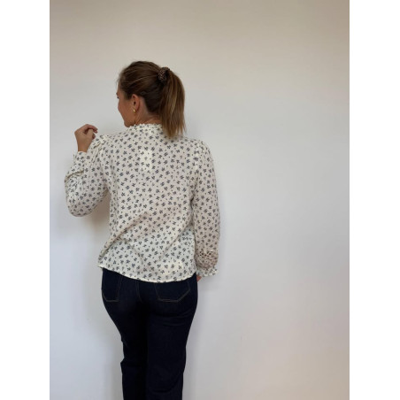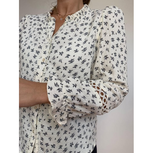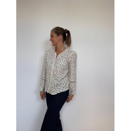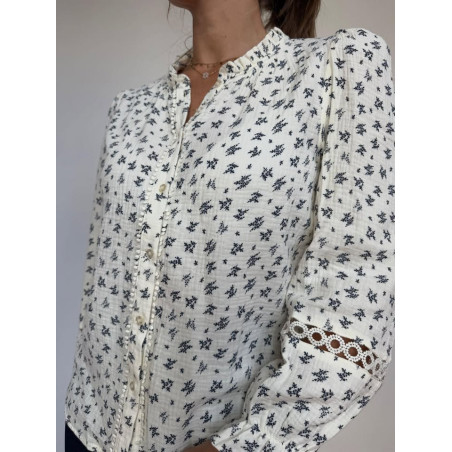 Blouse à motifs avec boutons de haut en bas et détails ajourés à la manche