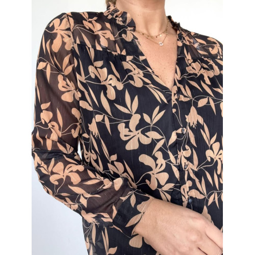Blouse à motifs avec liseré doré et boutons ainsi que sur doublure sur l'avant