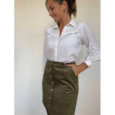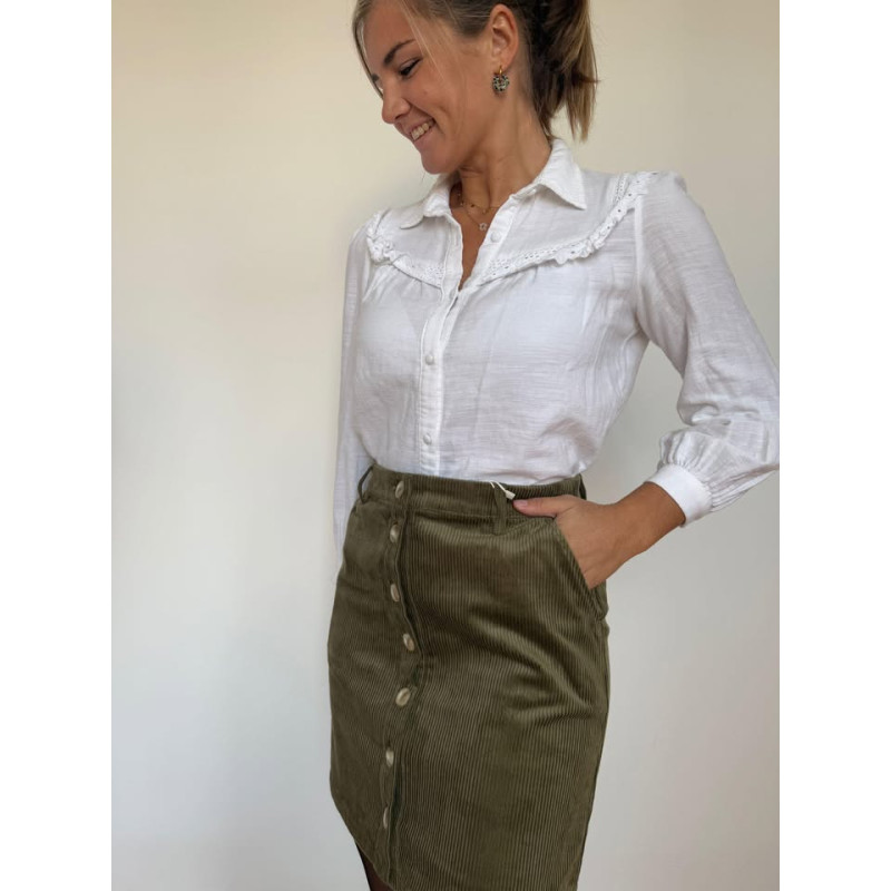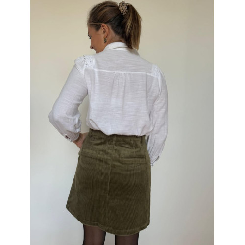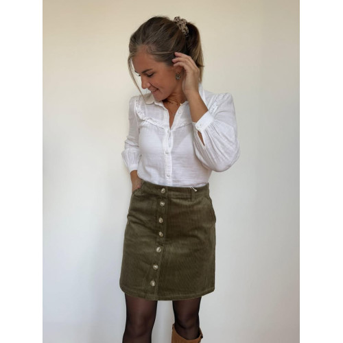 Jupe velours avec boutons sur l'avant ainsi que des poches de chaque côté et fausses poches à l'arrière