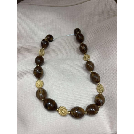 Collier à perles marron effet marbré ainsi que perles dorés en acier inoxydable avec chaîne réglable