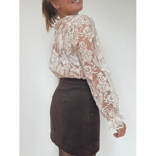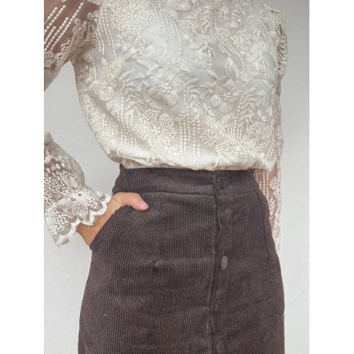 Jupe courte chocolat velours côtelée avec poches de chaque côté ainsi que boutons sur l'avant