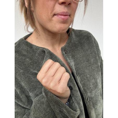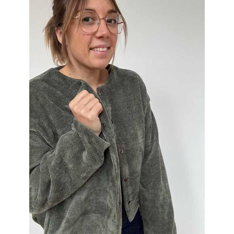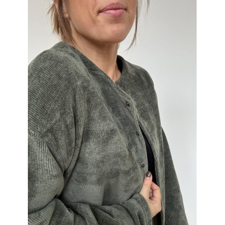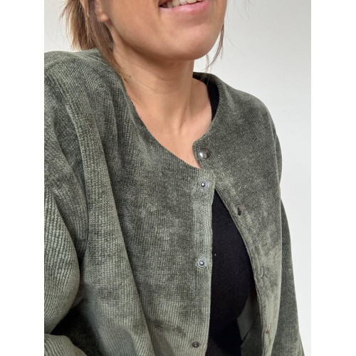 Veste douce avec pressions qui n'a pas de poches, resserré sur le bas