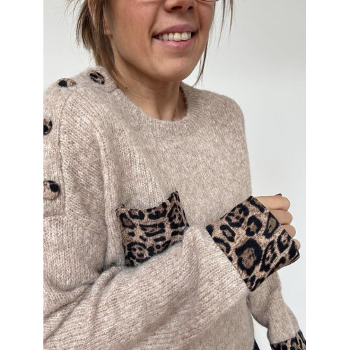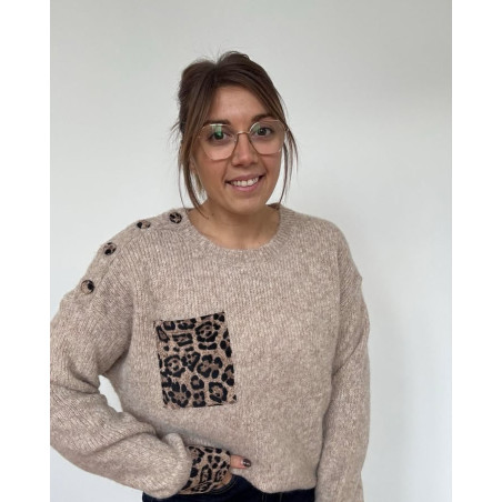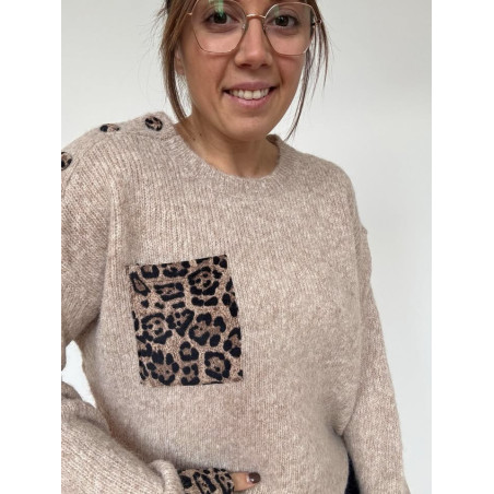 Pull beige aux détails léopard à la poche ainsi qu'aux manches & boutons sur l'épaule